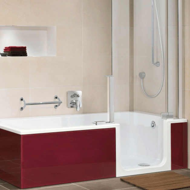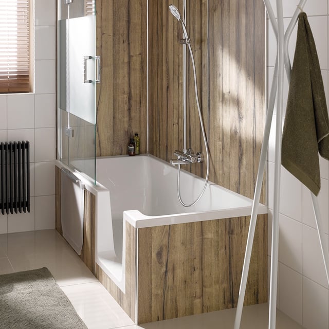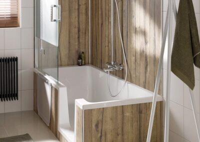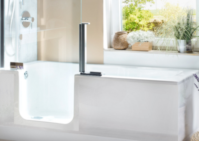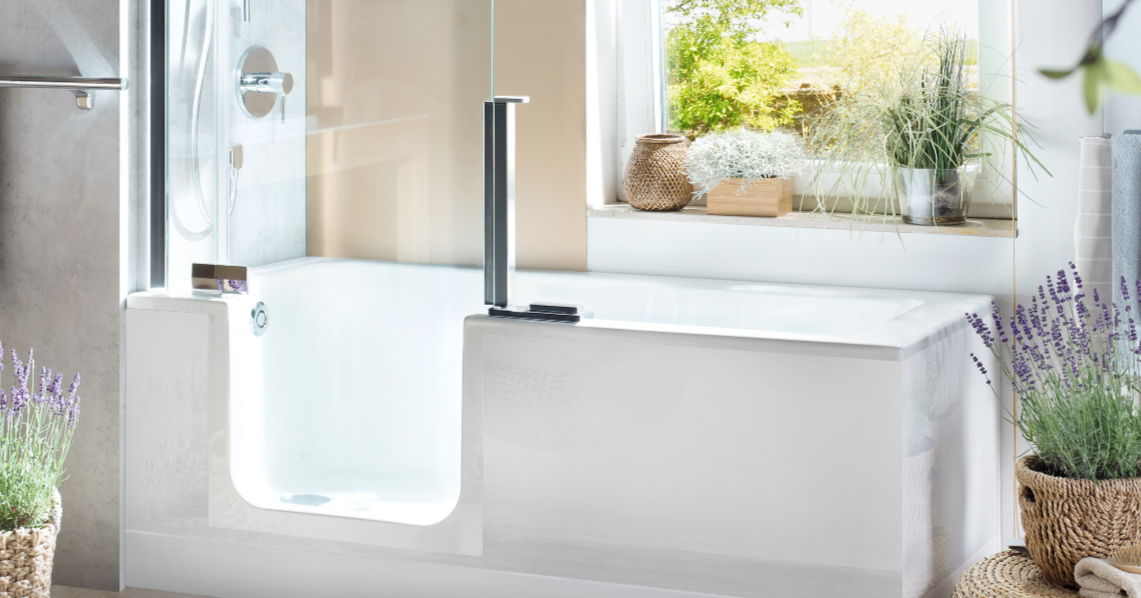 Eine Badewanne ist barrierefrei, wenn eine Tür eingebaut seitlich oder vorne eingebaut ist. Ergänzend helfen Haltegriffe, ein rutschfester Boden und ein elektrisch höhenverstellbarer Badesitz für mehr Sicherheit und Komfort.