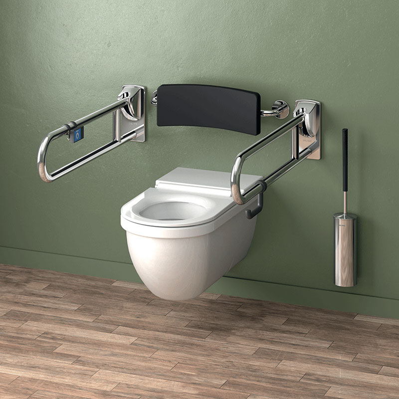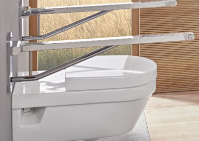 Barrierefreie WCs haben entweder Haltegriffe an beiden Seiten, an denen der Nutzer sich hochziehen und festhalten kann oder sind elektrisch höhenverstellbar. Klappbare Stützgriffe können für andere Bewohner weggeklappt werden. Automatische Spülfunktionen, Dusch-WCs oder Toiletten mit Hebe-/Senkanlage können zusätzlichen Komfort bieten.